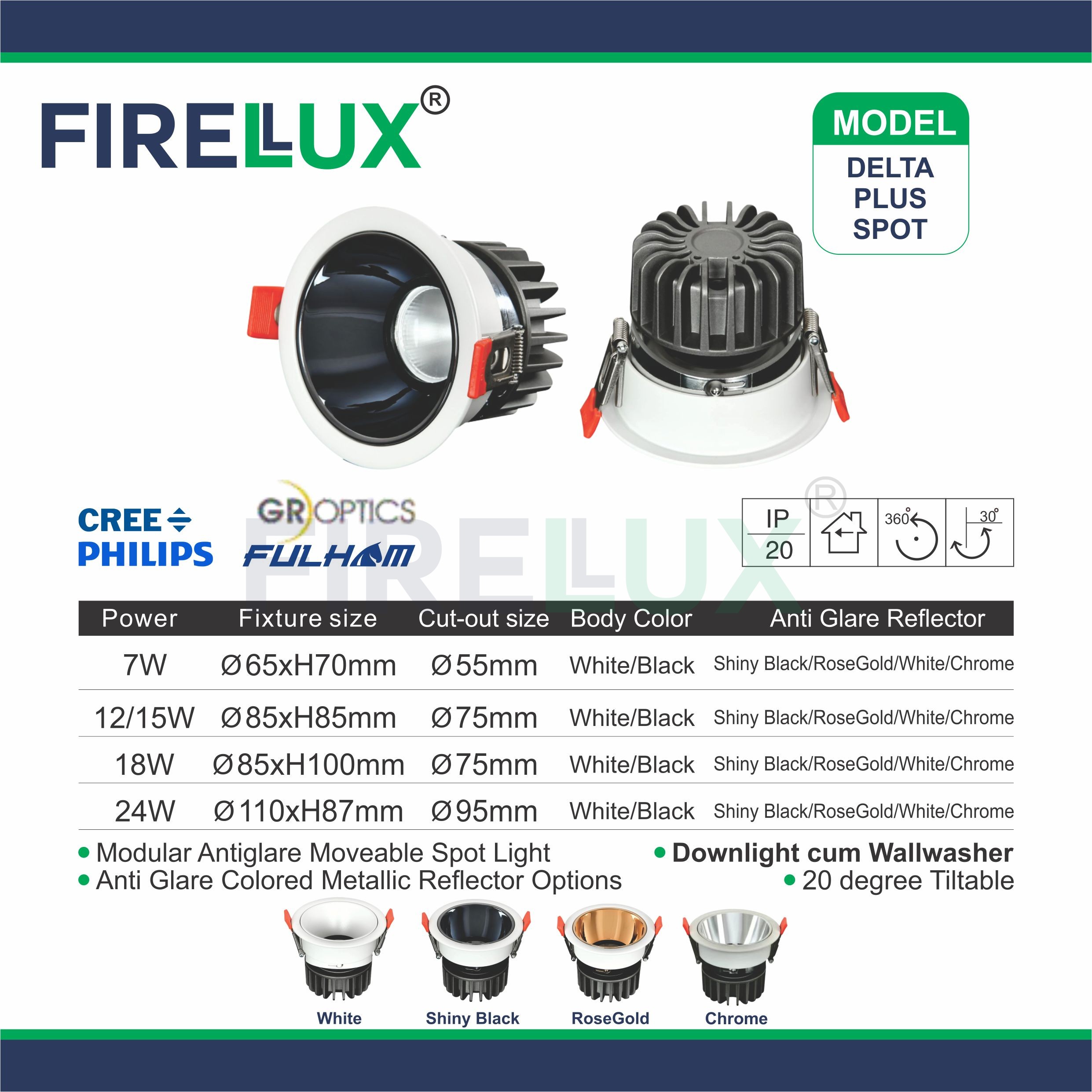 Delta Plus COB Spot is a premium spotlight series designed to offer exceptional lighting performance and versatility. Available in multiple power options and a wide range of reflector finishes, this spotlight is engineered to meet the lighting needs of both residential and commercial spaces. With its advanced heat sink design and superior GR Optics, it ensures optimal heat dissipation and brilliant light output, making it the architect’s best choice for lighting applications. Available in 7W, 12W, 15W, 18W, and 24W options, the Delta Plus COB Spot offers flexibility to suit a variety of spaces, from accent lighting to full-scale lighting installations. Powers a strong 20 degree tilt for a wall washer effect as well.