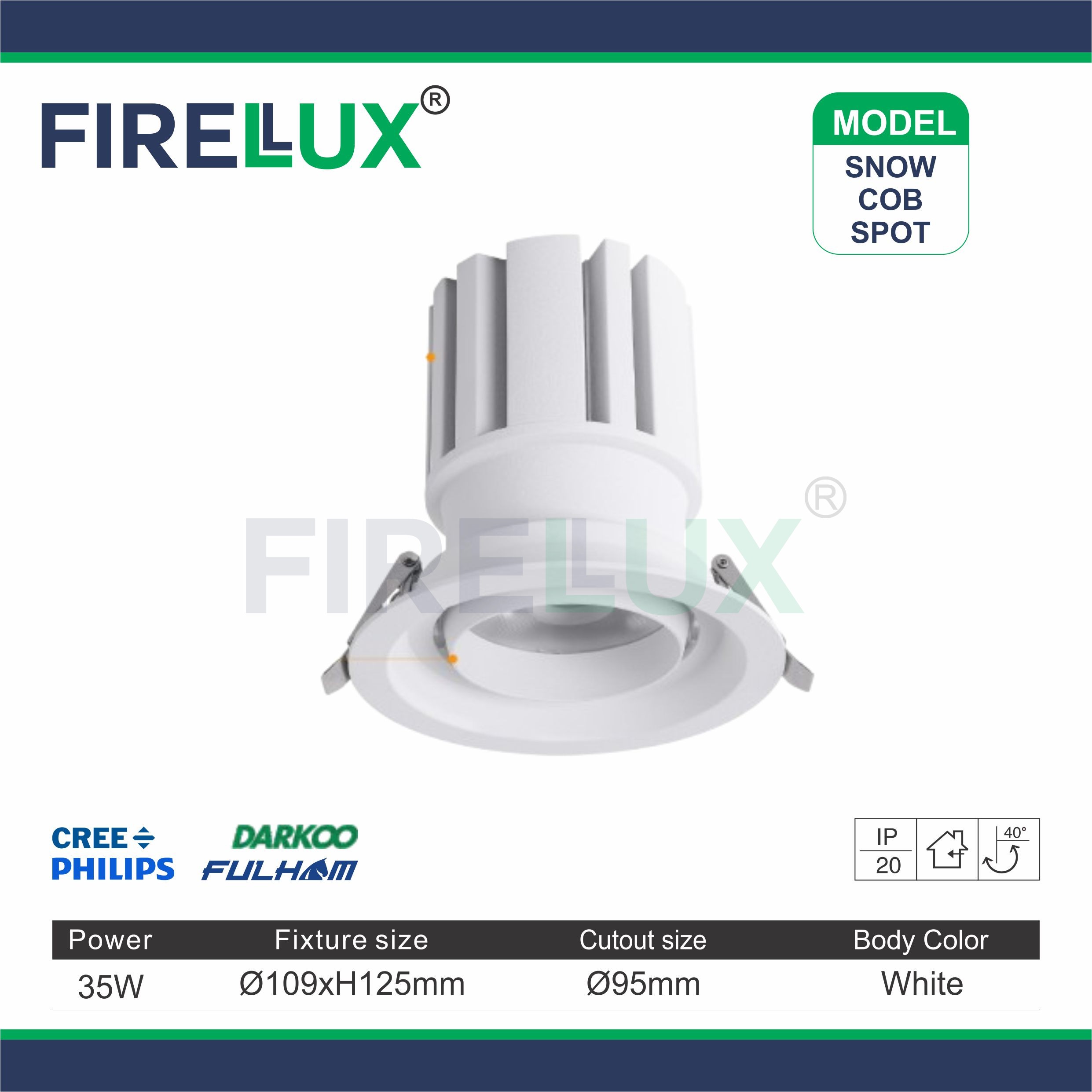 Available in a sleek white body color, the Snow COB Spotlight is offered in two power options: 25W and 35W outputs. Its durability, energy efficiency, and design make it a versatile choice for a variety of commercial lighting needs.