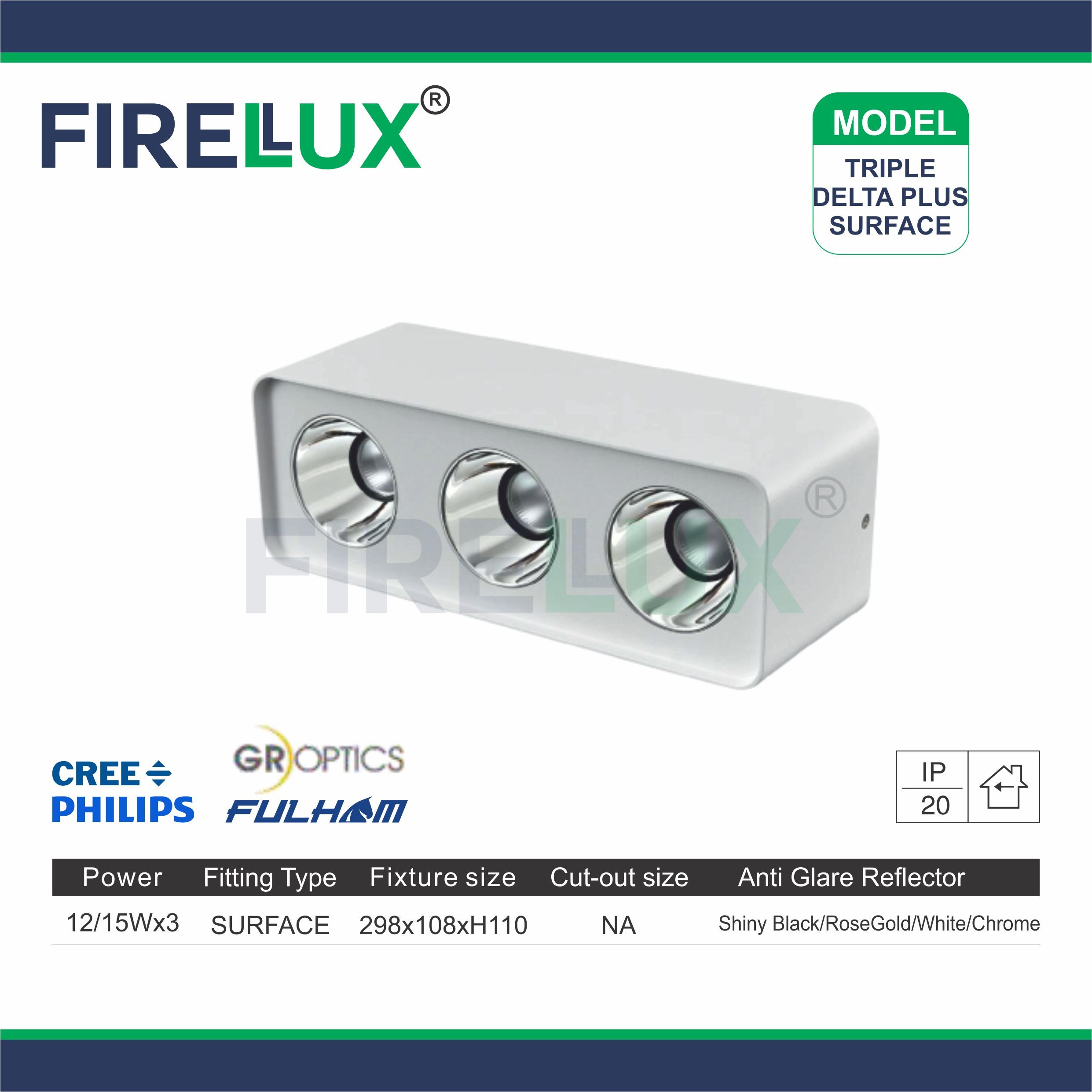The Triple Delta Plus Surface Spotlight is a versatile surface-mounted spotlight and downlight featuring three COB spots housed in a durable triple surface frame made from aluminum die-casting. This design allows for direct ceiling installation, eliminating the need for a false ceiling. Available in 3x12W and 3x15W power configurations, it provides flexibility in lighting intensity, making it suitable for both accent and general illumination needs.