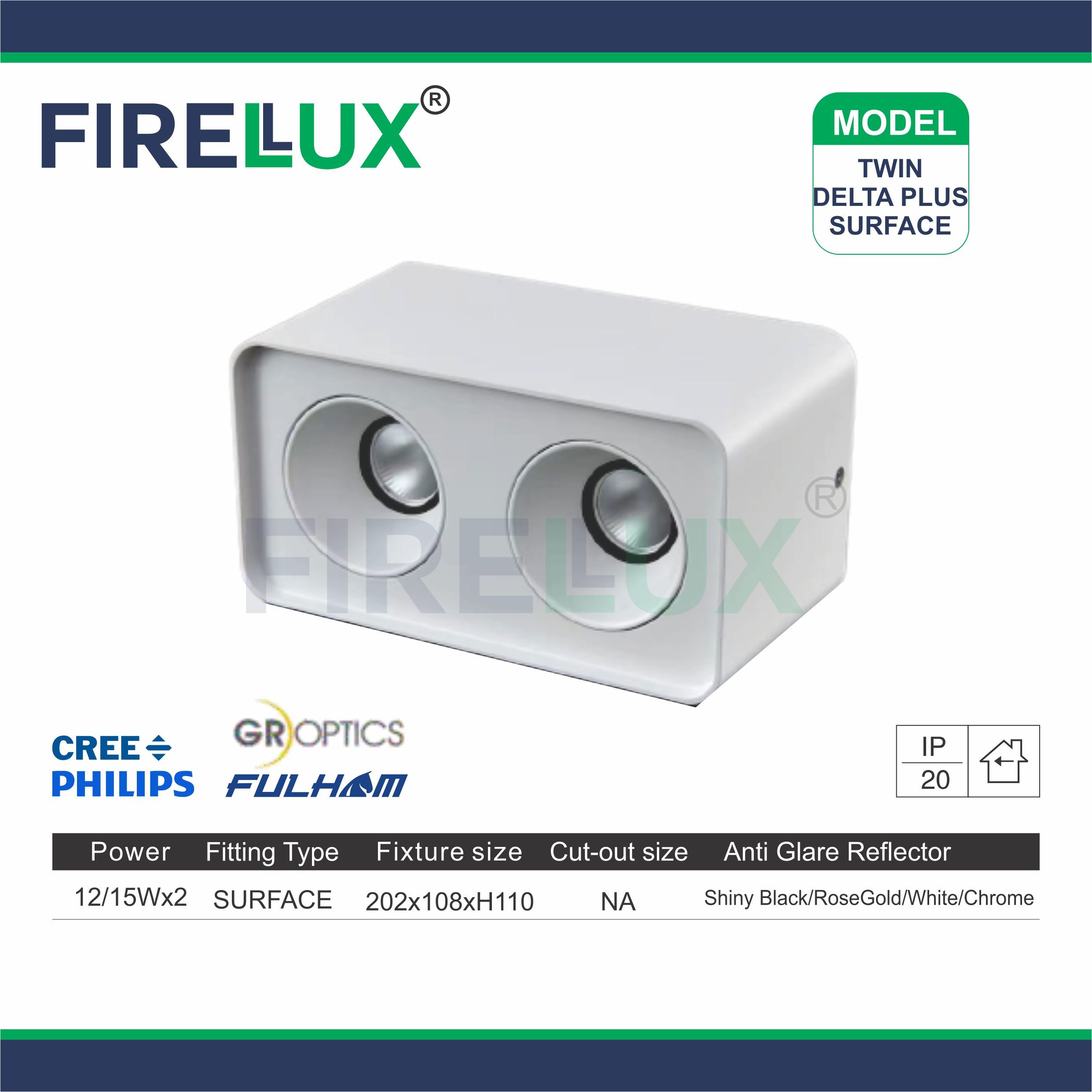 The Twin Delta Plus Surface Spotlight is a versatile surface-mounted spotlight and downlight designed for direct installation into ceilings without the need for a false ceiling. It features twin COB spots within a double surface frame, offering flexibility and a sleek appearance. Available in three power configurations—2x12W & 2x15W—it is suitable for a variety of lighting applications, providing both accent and general illumination.